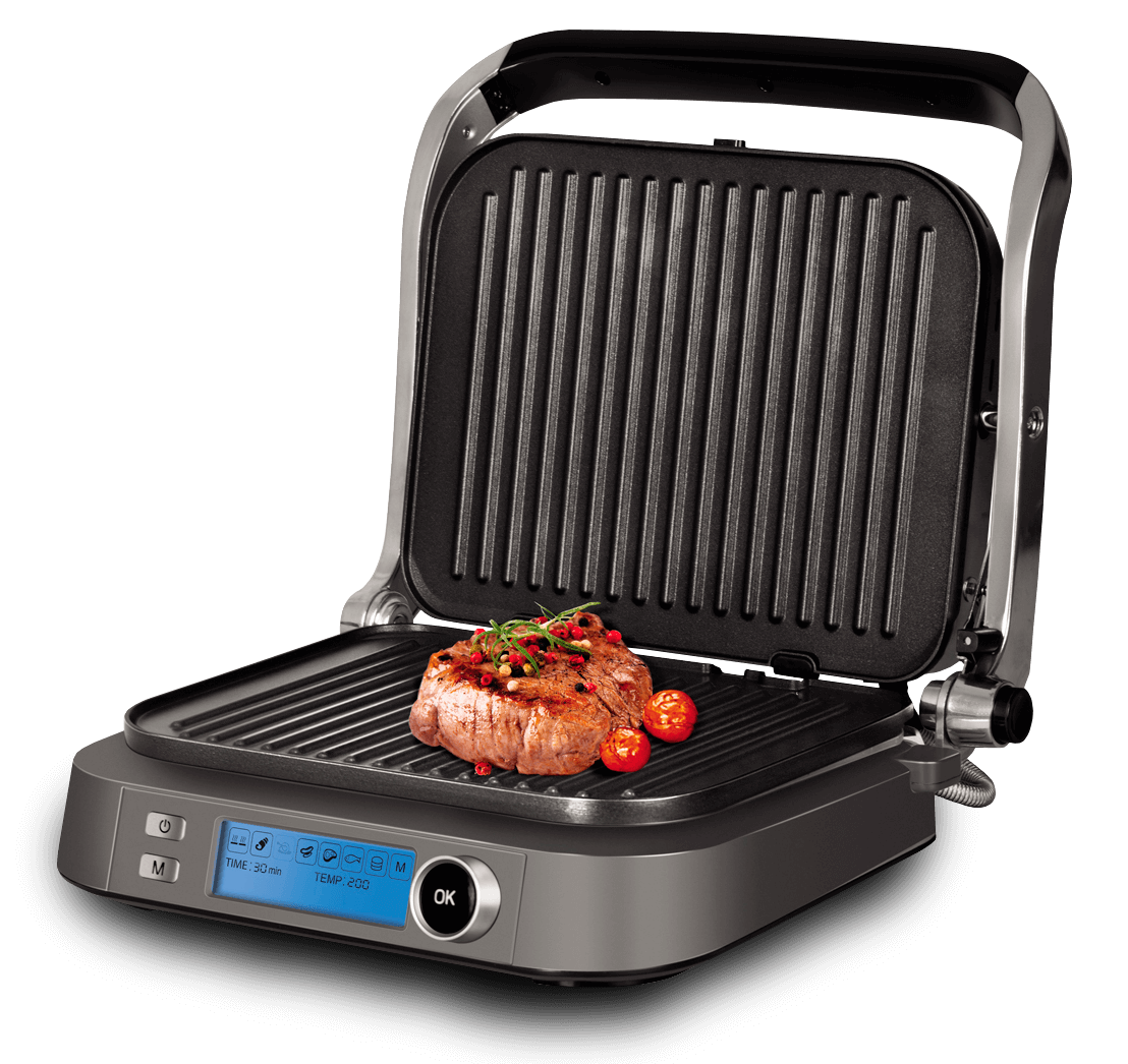 SteakMaster RGM-M816P оснащена множеством дополнительных функций по сравнению с классическими контактными грилями. Во-первых, здесь присутствует точная регулировка температуры. Устройство автоматически определит толщину продукта и сообщит, когда мясо достигнет выбранной степени прожарки: rare, medium или well-done. Вам не придется больше мучиться с непонятными режимами нагрева «побольше» и «поменьше» – Redmond SteakMaster позволяет установить нужное значение одним поворотом регулятора. Во-вторых, в гриль встроено 7 автоматических программ приготовления мяса, птицы, рыбы, бекона, сосисок и других блюд. А для поваров экстра-класса есть и ручной режим с возможностью настройки температуры и времени приготовления.